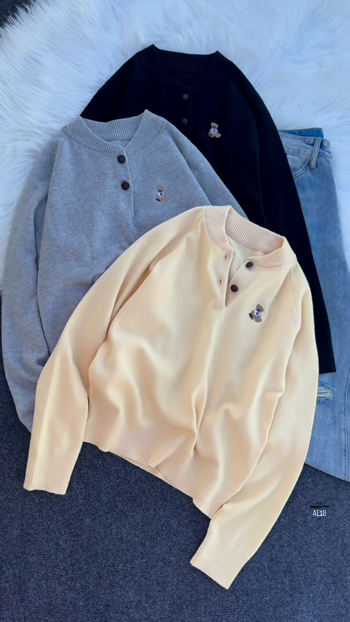 The teddy bear embroidery serves as a focal point, radiating youthfulness and positivity. It’s a timeless symbol that appeals across age groups, making these sweaters a favored choice for both young and mature fashion enthusiasts alike. The multi-button design at the collar introduces visual interest and lets wearers customize their neckline for extra warmth or a relaxed feel, blending functionality with charm. Soft ribbed bands at the cuffs and hem add subtle detailing and help provide a snug yet flexible fit, perfect for layering over t-shirts or pairing with scarves during cooler months.