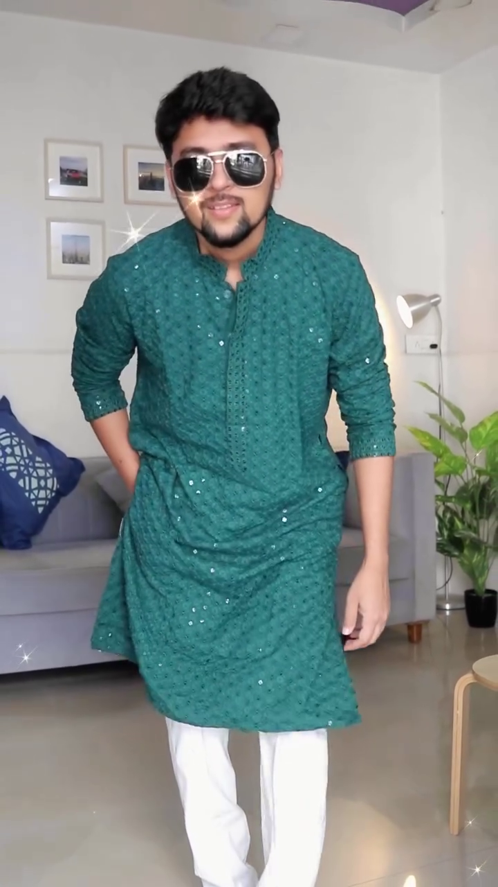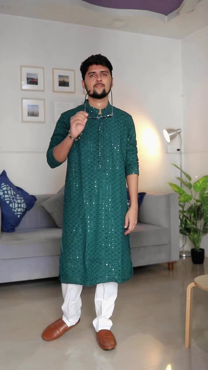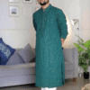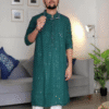 This emerald green sequin kurta isn’t just festive wear — it’s a confidence booster. It’s for the man who doesn’t just attend celebrations but becomes a part of the celebration itself. Bold, refined, and effortlessly striking, it’s your go-to choice for moments that matter.
