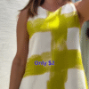 What truly sets this piece apart is its unique lime yellow brushstroke print, set against a clean white canvas. The blocky pattern creates a fresh and contemporary look, reminiscent of hand-painted designs or modern runway minimalism. It’s simple, bold, and impossible to ignore.